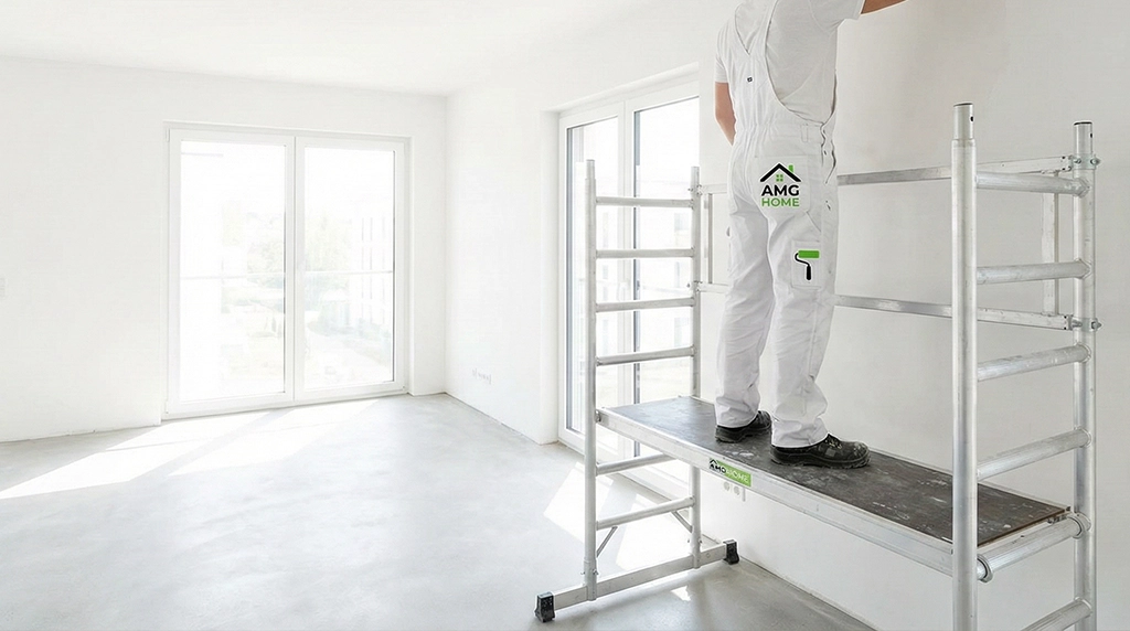 Użycie profesjonalnego rusztowania pozwoliło na szybką i bezpieczną pracę przy sufitach, a idealnie przygotowana wylewka czeka teraz na montaż podłogi drewnianej. To przykład standardu AMG HOME: idealnie białe, równe ściany bez smug.