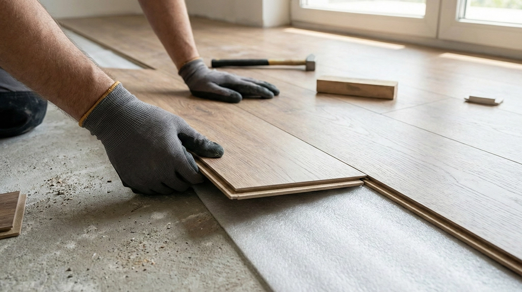 Zaawansowany etap prac wykończeniowych, gdzie technologia spotyka się z klasyką. Zdjęcie obrazuje wykorzystanie laserów krzyżowych do idealnego wypoziomowania podłóg względem sufitów.
